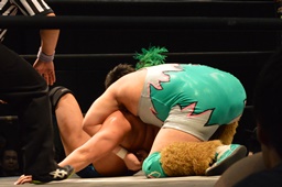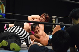 石井カニばさみで倒してグラウンドヘッドロックに(右写真)。遠藤エルボー、石井フライングメイヤー、遠藤ヘッドシザーズでブレーク。石井は入江にタッチ。