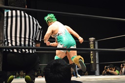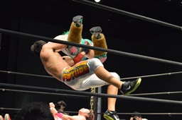 石井ミドルキック、ジャンピングダブルニードロップ(右写真)、カウント2。