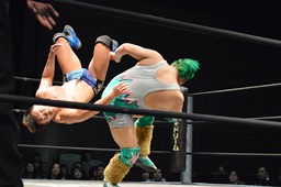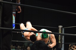 石井をリングに戻すと遠藤がスナップスープレックス(左写真)、カウント2。竹下にタッチ。