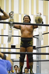 アントンがダスティに、平田はこのタイトルを奪取した時のフィニッシュ技、カウンターの首固めに(左写真)、しかしアントンは2で返す。
