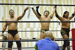 平田がエゴイストドライバーの体勢に入ると遠藤と竹下がダブルのトラースキックで阻止(左写真)。