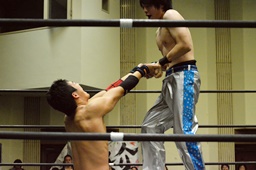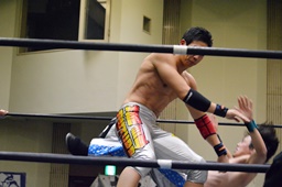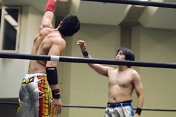 旭は竹下の両手をつかみ下からキック(左写真)。