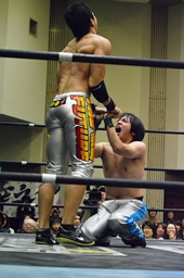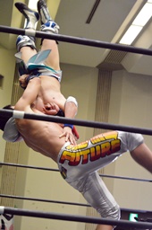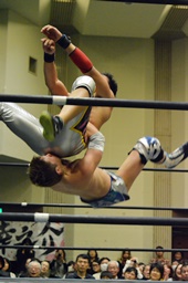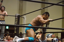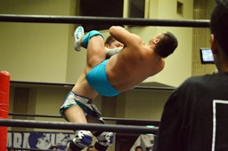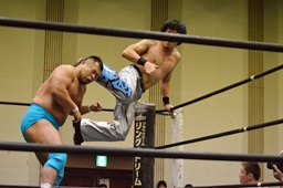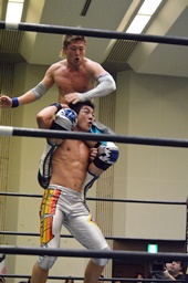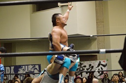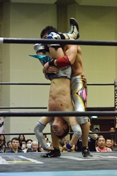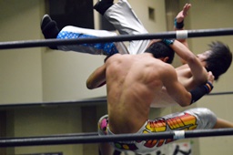 旭ロープに飛ぶ、竹下キャッチしてブルーサンダー(右写真)、カウント2。