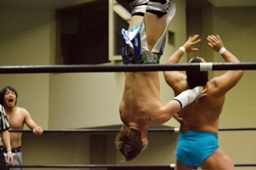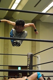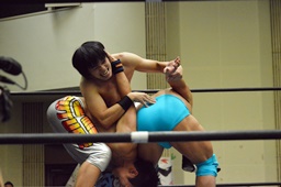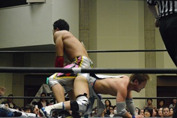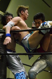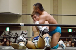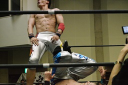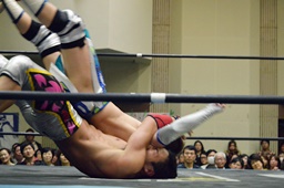 松永ロープに振ってショルダースルー(右写真)、キャメルクラッチ、旭がカット。松永ブレーンバスター、竹下にタッチ。5分経過。