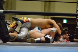 松永バックドロップ、カウント2。パイルドライバー、スモーピオンデスロック(右写真)、旭がカット。