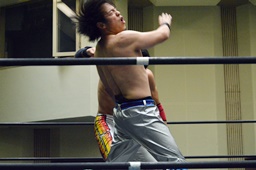 旭ヘッドロック、竹下がロープに振ってのショルダーブロックの打ち合いは竹下の勝ち(左写真)。フライングメイヤーとヘッドシザーズの応酬、両軍タッチ。