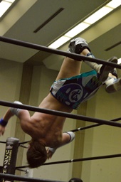 持ち上げてコーナーの旭にパワーボムの形でぶつける(右写真)。