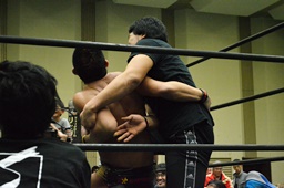 場外でボディスラム(右写真)。