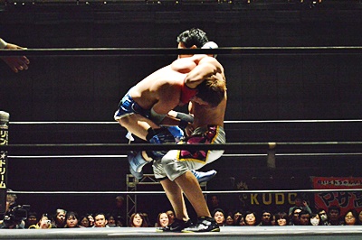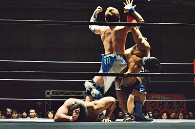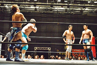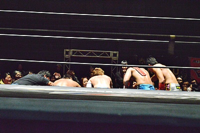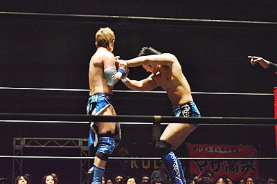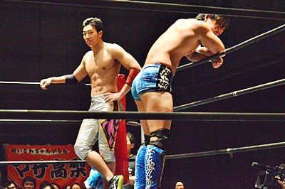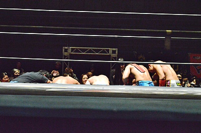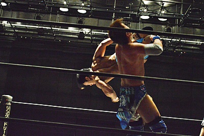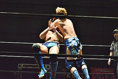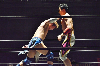 遠藤松永をコーナーに詰めて逆水平連打(左写真)。