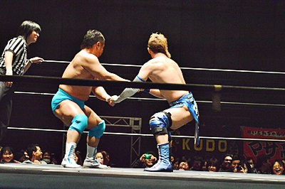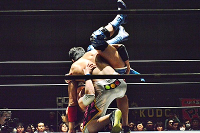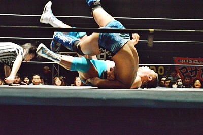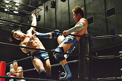松永ロープに振る、竹下切り返してゼロ戦キック(右写真)、遠藤にタッチ。