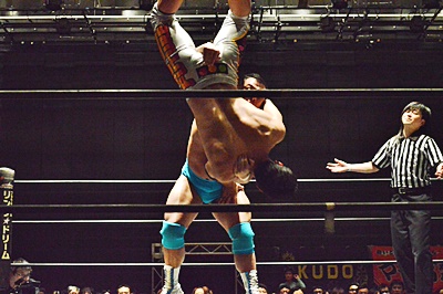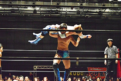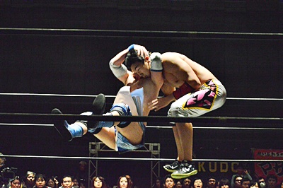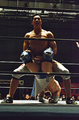 大石がブレーンバスター狙うが竹下はブロック、逆に2回リフトアップして(左写真)、
