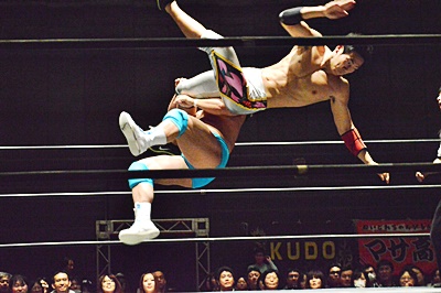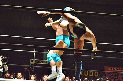 松永遠藤にDDT(左写真)、ロープに飛ぶ、
