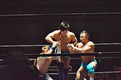 大石遠藤に欽ちゃんキック、ダウンしたところにストンピング、フィストドロップ(左写真)。松永にタッチ。松永チョップ連打、ロープに振ってサイドスープレックス、カウント2。大石にタッチ。