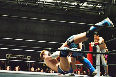 大石竹下にクロスボディ、竹下キャッチして肩に担ぐとハワイアンスマッシャー(右写真)。
