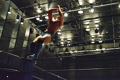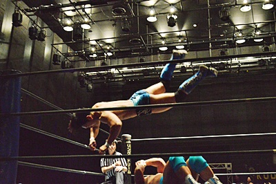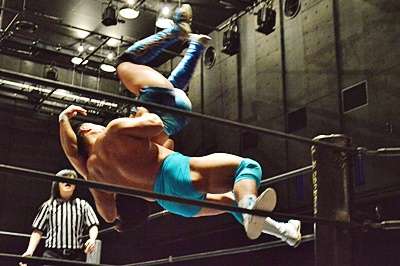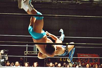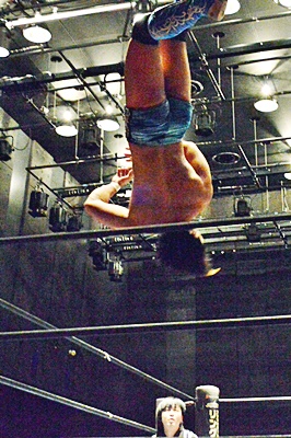 竹下コーナーに上ってダイビングクロスボディ(左写真)、カウント2。