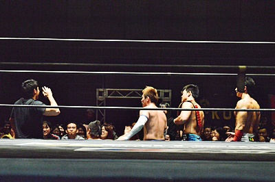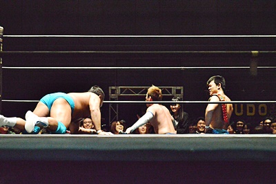 先発は遠藤と大石。ロックアップ、大石ヘッドロック。もちろんはるかさんの方を見て(左写真)。