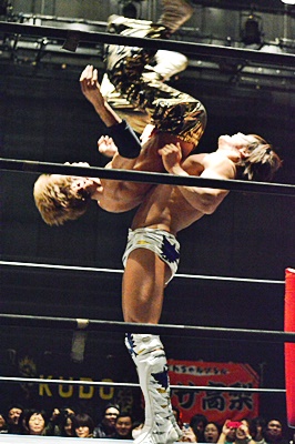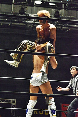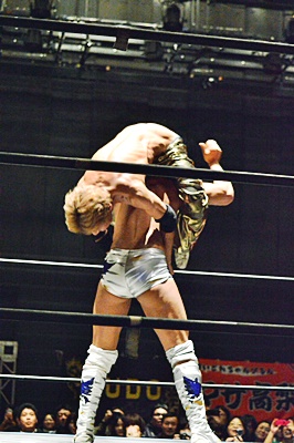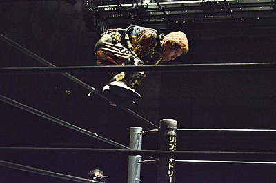 コーナーに上ってゴージャスワントーン☆ボム(右写真)、カウント2。