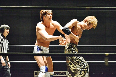 ロックアップ、飯伏ロープに押し込む、ブレーク。再度ロックアップ、飯伏腕を取る(左写真)、