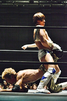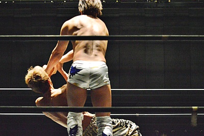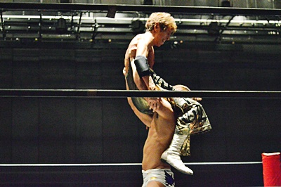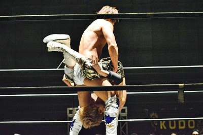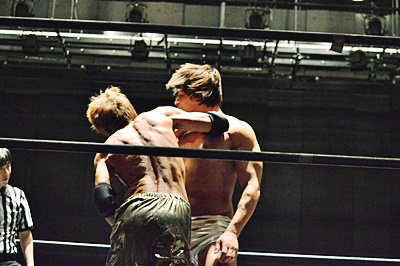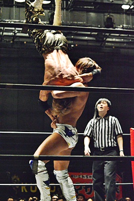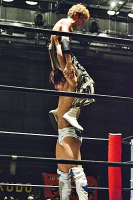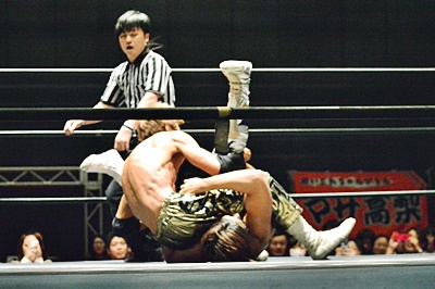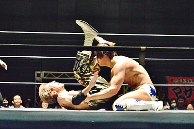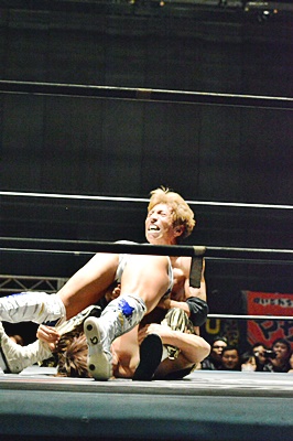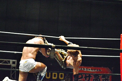 飯伏片逆エビ固め(右写真)、松野ロープ。