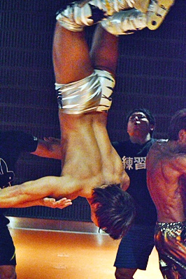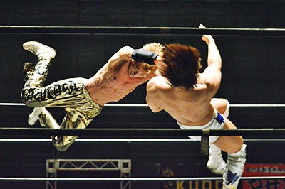 飯伏机に上ってムーンサルトアタック(左写真)、松野はかわし宮武とマイケルにヒット。