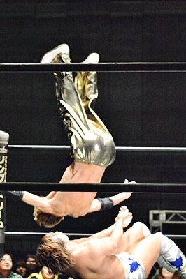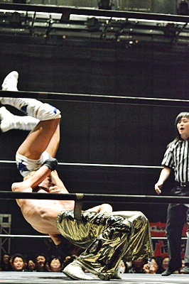 その場跳びムーンサルトプレス(右写真)、カウント2。