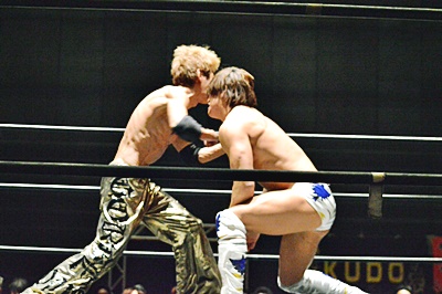 飯伏ロープに振る、松野コルバタ、飯伏場外転落。松野場外に飛ぶ振り(左写真)、ロープをくぐってエプロンからダイブ、場外乱闘に。