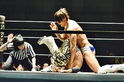 飯伏逆水平(左写真)、松野ダウン、飯伏カバー、カウント2。