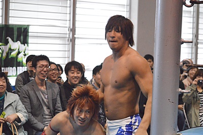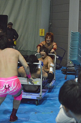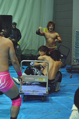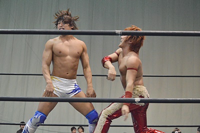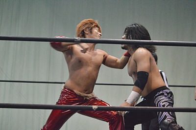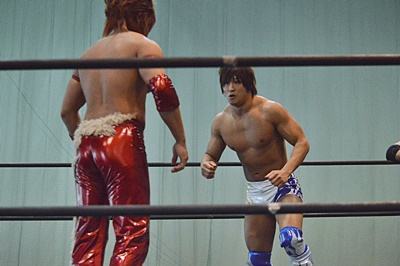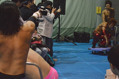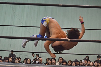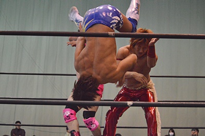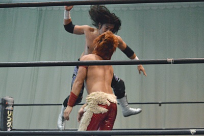 高尾エルボー、ロープに振ってバックエルボー、佐々木かわしてドロップキック(右写真)。両軍タッチ。