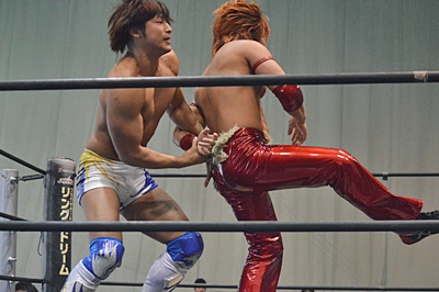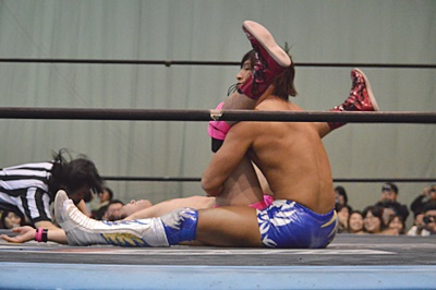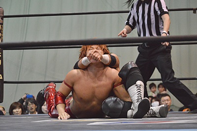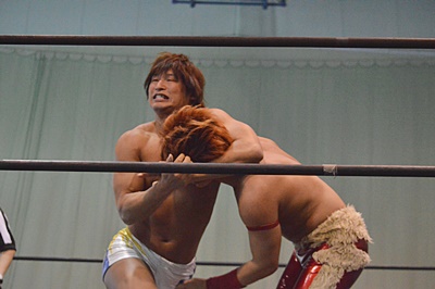ロックアップ、飯伏が腕を取る、高尾切り返す、飯伏切り返してハンマーロック(右写真)、高尾ハンマーロックからヘッドロック。