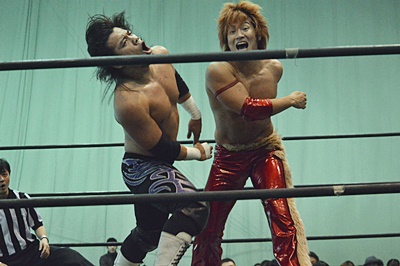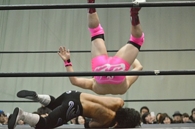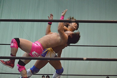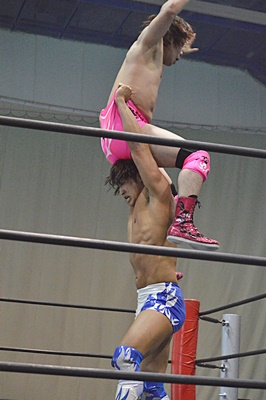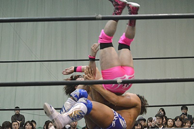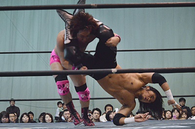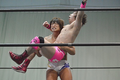 佐々木がロープに振ってケブラドーラ・コン・ヒーロ(左写真)、