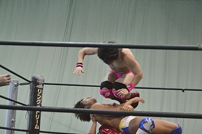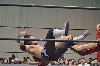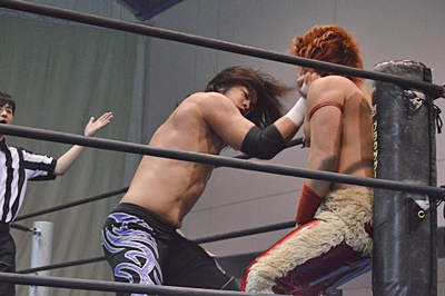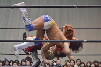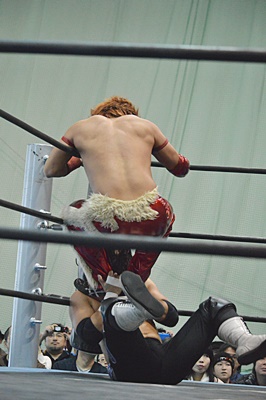 高尾ロープに飛んでドロップキック(右写真)、カウント2。
