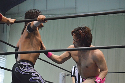 石井佐々木にエクスプロイダー式ニーリフト。石井ロープに飛ぶ、佐々木はキャッチ、ロープに引っ掛けてドロップキック(右写真)。