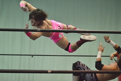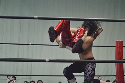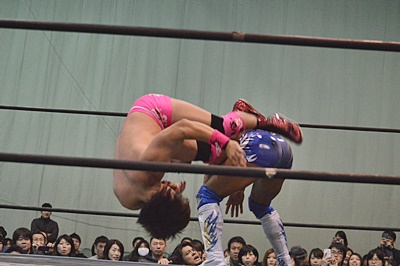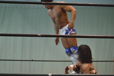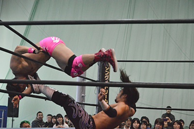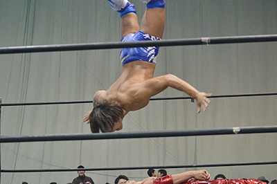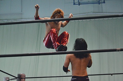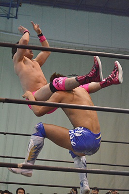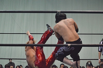 ロープに振ってドロップキック(右写真)、カウント2。高尾にタッチ。5分経過。