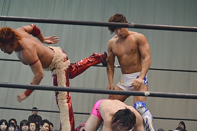飯伏スワンダイブミサイルキック行くが高尾かわす、飯伏コーナーの石井にエルボー、石井かわして逆にエルボー。石井ロングに入ってダブルでロープに振る、飯伏クローズラインをかわして2人にオーバーヘッドキック(左写真)。