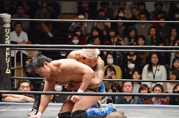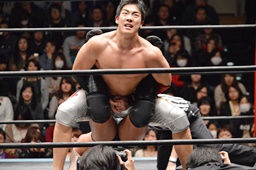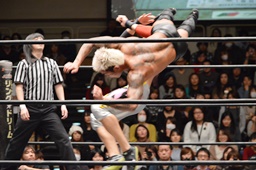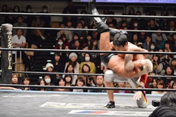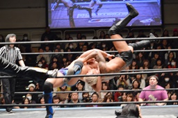 坂口が最近多用しているスナップスープレックス(左写真)。投げたところにKUDOがエプロンからトップロープ越しのダブルニードロップ投下。坂口がカバー、竹下がドロップキックでカット。KUDOが竹下を条がに出す。坂口はKUDOにタッチ。