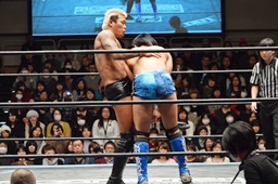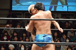 KUDO切り返してハンマーロックからヘッドロック、フライングメイヤー、竹下ヘッドシザーズ(右写真)。KUDO首を抜く。両軍タッチ。