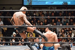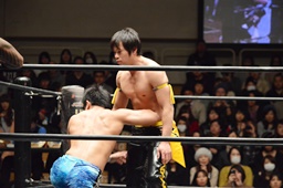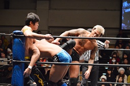 竹下ロープに飛ぶ、坂口カウンターのドロップキック(左写真)、KUDOにタッチ。