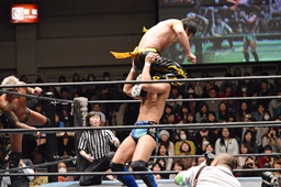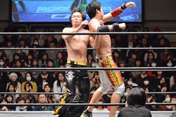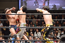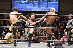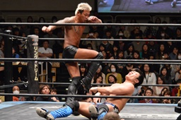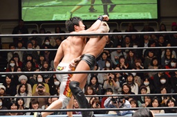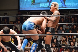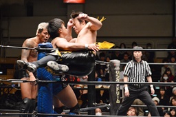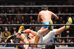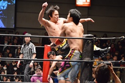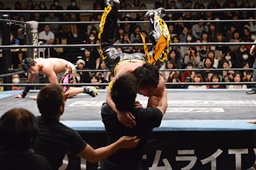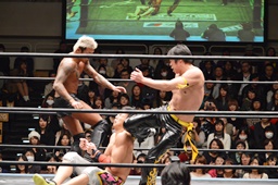 KUDO足を取らせてキャッチ延髄(左写真)。遠藤がKUDOにスワンダイブエルボー。