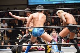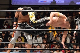 ダブルのガットショットからエルボー連打(左写真)、竹下ハーフハッチ、遠藤その場跳びシューティングスタープレス、カウント2。