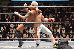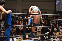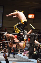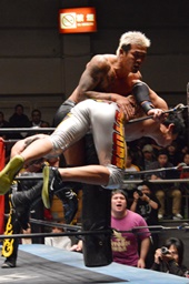 コーナーに上ってダイビングダブルニーアタック(左写真)、坂口にタッチ。
