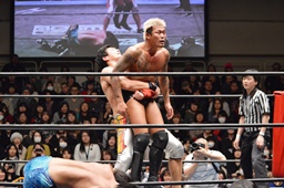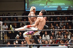 遠藤が坂口にスカイツイスタープレス(右写真)。これは効いた。