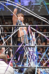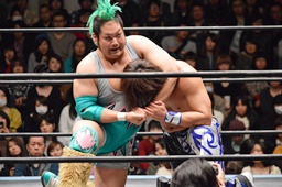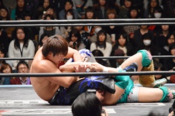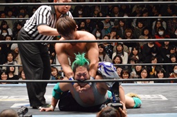 HARASHIMAキャメルクラッチ、両腕も固められた入江はロープに噛みついてエスケープ(左写真)。10分経過。