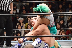 HARASHIMAロープに振る、入江ブロック。HARASHIMAビッグブーツ、逆水平、ロープに振る、入江切り返してブラックホールスラム(右写真)。