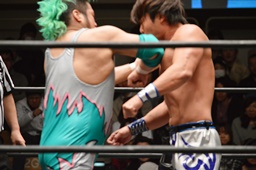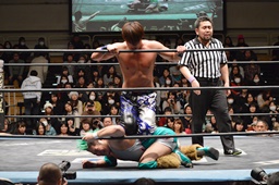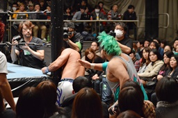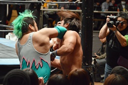 HARASHIMAはレッグロックに切り返す、入江後頭部にヘッドバット入れてブレーク。入江はHARASHIMAを場外に出す(右写真)。