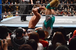 HARASHIMAは入江を水面蹴りで倒すとエプロンから引っ張り出してトップロープ越えのギロチンドロップ(左写真)。