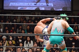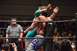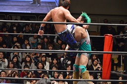 ジャンピングブレーンバスター(右写真)。入江コーナーに上る、HARASHIMA起き上がって串刺しビッグブーツ。