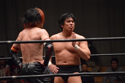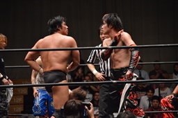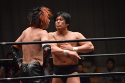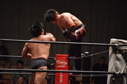 イサミボディスラム、コーナーに上る、GENTARO立ち上がって張り手(左写真)。