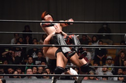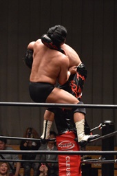 GENTAROコーナーに上って雪崩式ブレーンバスター(右写真)、カウント2。