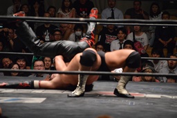 イサミ上になって両足でカバー(右写真)、カウント2。