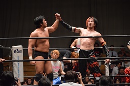 イサミ無理やりGENTAROの手を取って挙げる(右写真)。